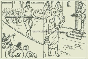 He started the ropewalk once again. He triumphantly looked around. While up there, he noticed a beautiful woman offering sweet food to a young monk. She was in the prime of her youth and was very attractive and highly graceful. What surprised Ilächikumär was that the monk was completely unaffected by her beauty. He compared it to his own situation. He had changed his entire life for the beauty of one girl and the monk was impervious to the lovely woman in front of him. He was amazed by the self-control and detached attitude of the monk towards the beautiful woman. What power kept the monk aloof in the presence of that woman? In addition, while remaining aloof, peace radiated from his face! This detachment of the monk raised a succession of thoughts in the mind of Ilächikumär.